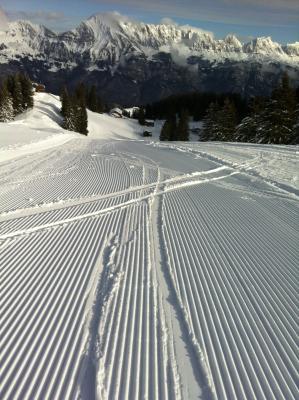 In der Leist NE-Flanke gut gesetzter Pulver auf einer harten Unterlage, ab Maschgenkamm bis Tannenbodenalp seidenweiche Piste vom Feinsten