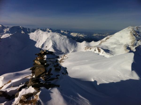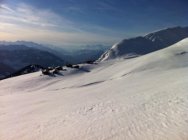 Bei Fatschel hatte es ca. 35 cm gesetzten Schnee mit Sonnenharst. Im mittleren Teil bis zu den Goldgruben zwischen 40 und 60 cm Pulver-Karton. Im Gipfelbereich zwischen 0 und 60 cm Karton, z.T. auch tragender Windharsch.