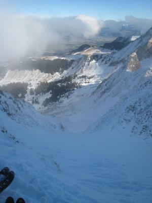 Erstaunlich gut. Wenig aber gut zu fahrender Pressschnee. Im Couloir selbst sogar wie selten gute Verhältnisse.