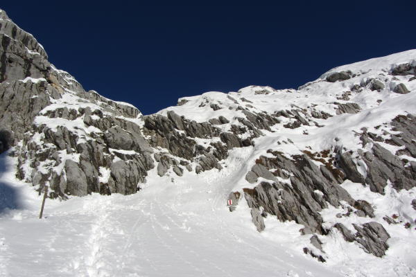 Wir hatten 15m Seil dabei was beim Abstieg über die kleine Felsstuffe sehr hilfreich war.