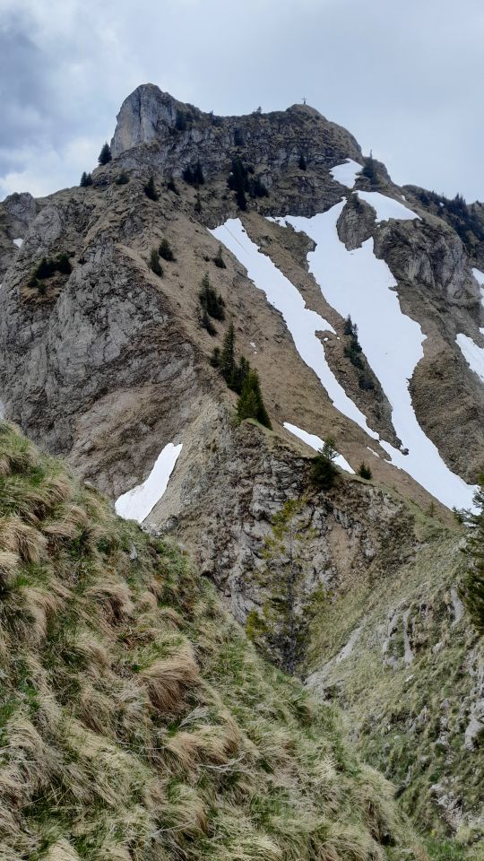 Die ganze Route war schneefrei, aber auf schattigen Stellen (Aufstieg auf Spitzflue-Vorgipfel, das erste Stück nach dem Sattel zwischen Spitz- und Fochsenflue) ziemlich feucht / schlammig. Ich war froh, den Pickel dabei zu haben. Der Abstieg von Spitzflue zum Sattel hingegen trocken, da südexponiert.