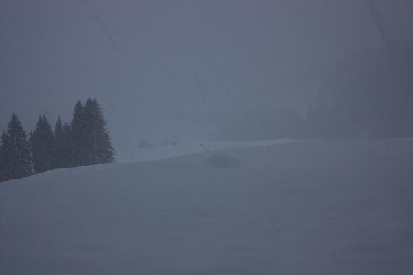 Schnefall, nebelig, ca. 30 cm Neuschnee (Pulver).