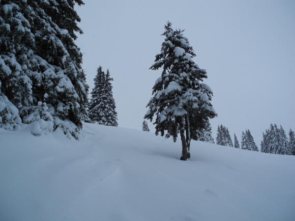 Beim Start am Parkplatz um etwa 10:00 Uhr ca. 5cm Neuschnee. Ganzer Aufstieg leichter Schneefall. Auf dem Breiten Rücken oberhalb Gründli etwas Wind und einige Schneeverwehungen. Der Rest war ok. Für die Abfahrt sehr gute Schneeverhältnisse (Pulver) aber die Sicht war nicht immer sehr gut.
