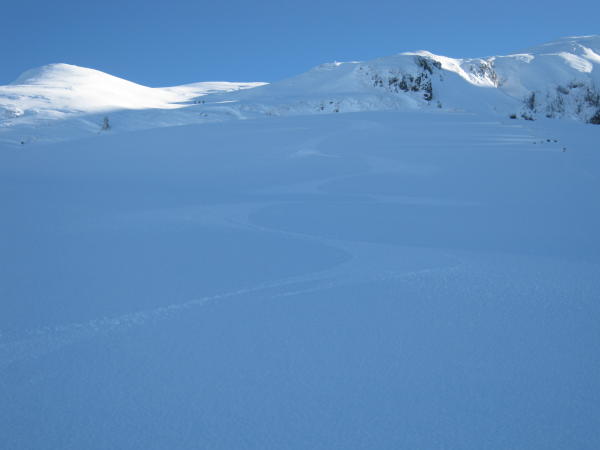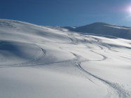 Genügend Schnee, der abgesehen von kurzen Bruchharstzonen recht gut zu fahren ist. Kein Steinkontakt.