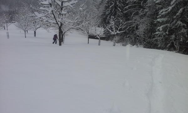 Sehr tiefer, feuchter Neuschnee. Ausreichend Schnee aber sehr anstrengend zu spuren.