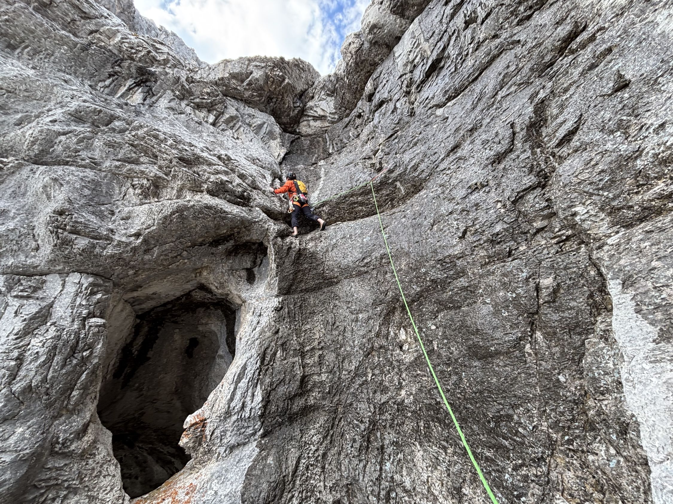 Zum Einstieg muss noch ein kurzes Schneefeld überwunden werden, in der Kathedrale feucht und sogar noch etwas vereist! Beginn des Himmelquergangs auch noch etwas feucht und daher unangenehm. Ansonsten trocken und auch auf den Zwischenbändern kein Schnee.