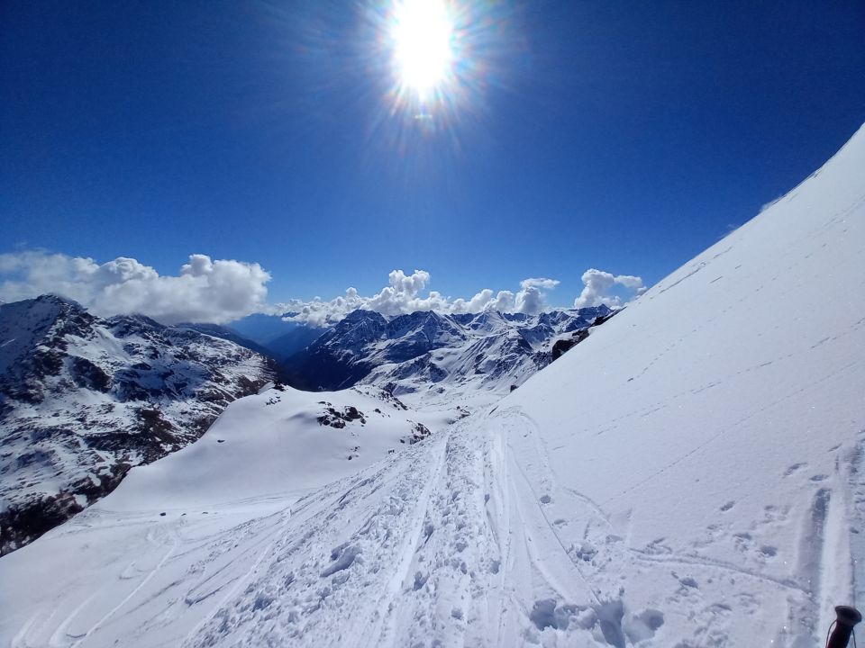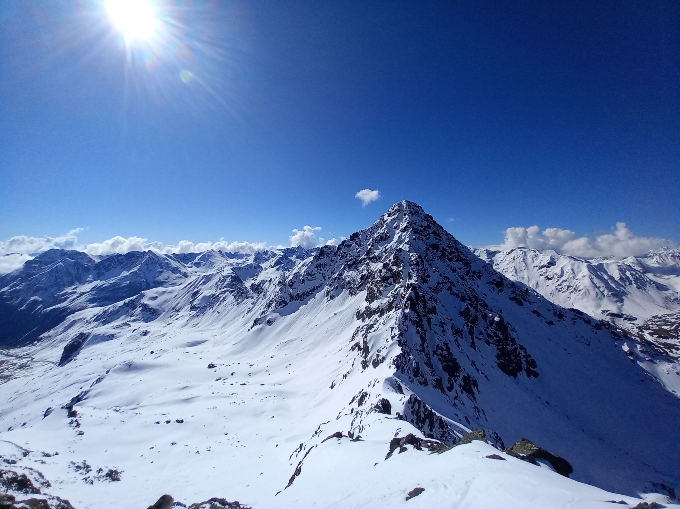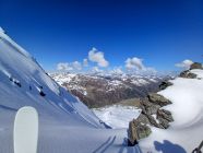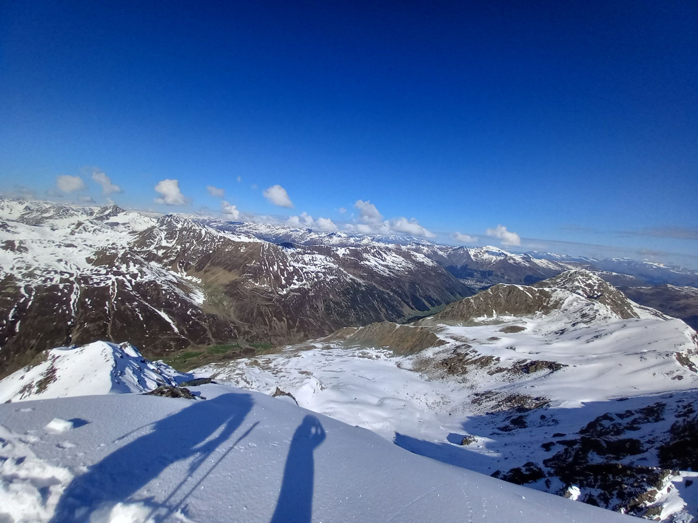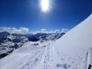 Start um 7:40 bei der Passhöhe. Gegenüber dem Vortag nicht mehr pulvrig und etwas gefroren aber nicht eisig, noch genug Schnee. Hurtig hoch in den Kessel und über die Gipfelmulde zum Skidepot, gute Trittschneespur zum Gipfel. Abfahrt auf gleicher Route bis in den Kessel, nachher Direktabfahrt steil zum Pass, Schnee um 11Uhr schon arg weich.