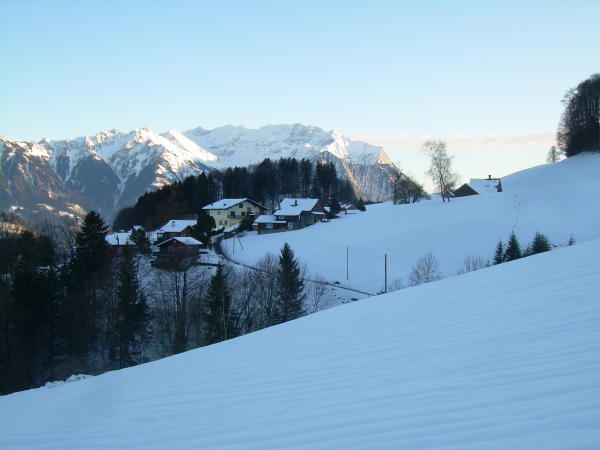 Die ersten 500 Abstiegsmeter waren heute sensationell gut, toller Pulver in für Schneeschuhe idealer Hangneigung. Danach gings bis Hüseren recht mühsam durch Bruchharsch, der bei Skifahrern möglicherweise noch getragen hat. Unterhalb Hüseren weiterhin Bruchharsch, aber weicher und erträglicher.