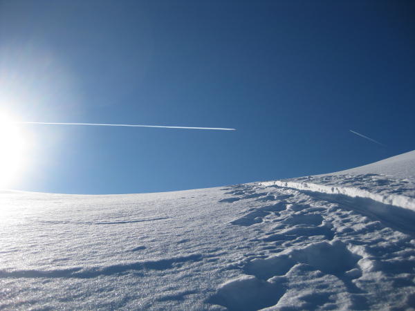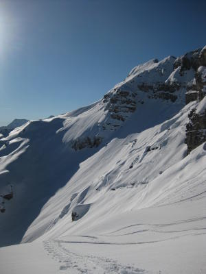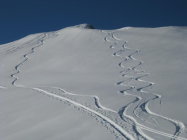 Praktisch alle Expositionen sind befahren, viele Spuren über die Guscha-Flanke.