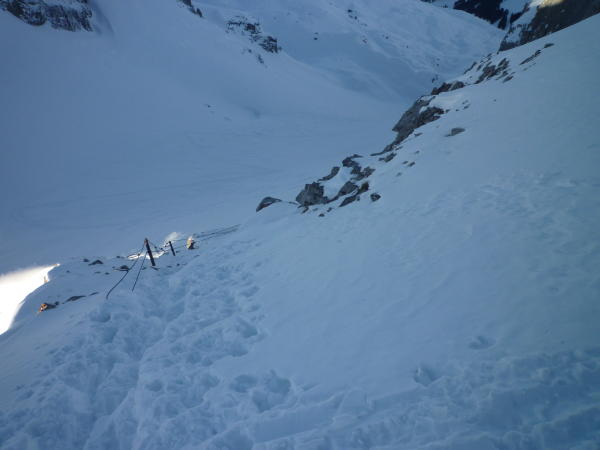 In der Hangquerung zum Nordfuss des Chli Chaiser reichlich Triebschnee, mit Entlastungsabständen ging es gut.