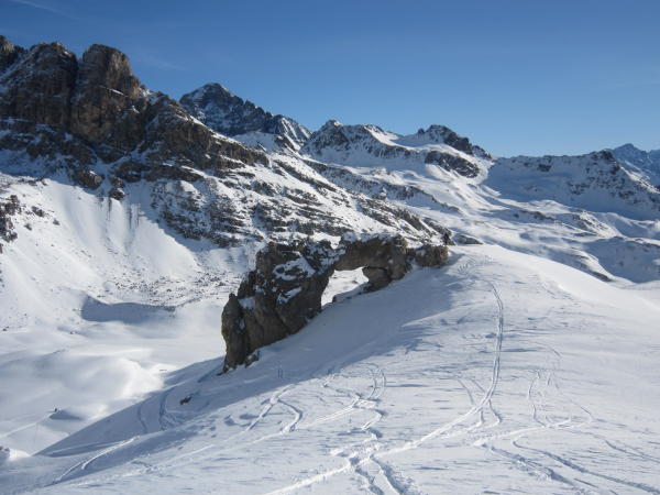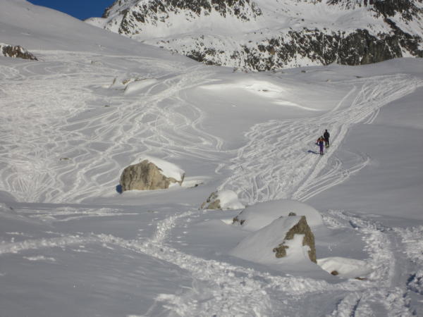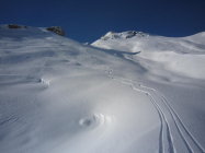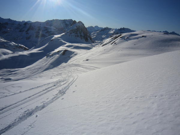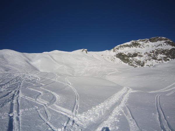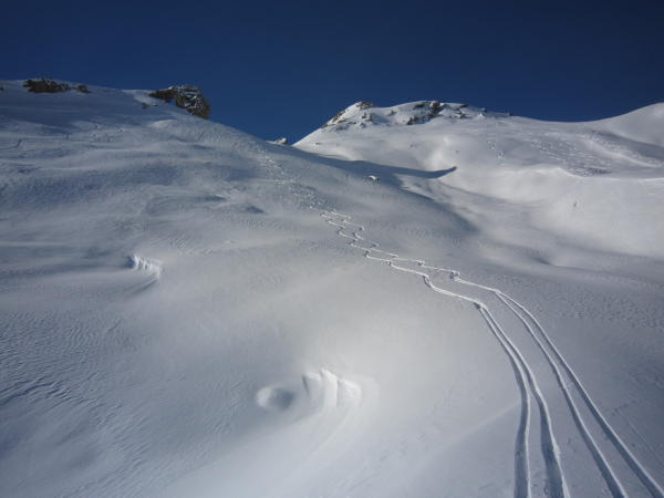 Es hat nicht viel Schnee, aber es reicht. Im unteren, flachen Teil muss man gut schauen, sonst geht es nicht ohne Steinkontakt. Der Gipfel hatte und hat viele Besucher, deshalb sind die Hänge stark verfahren. Schnee gibt es in allen Varianten. Pulver, Nass, leichter Bruchharst je nach dem, wie der Hang liegt.