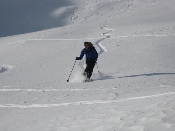Schnee fester Pulver, auf den Sonnenhängen morgens leichter Deckel der sich aber nachmittags aufgeweicht hat.