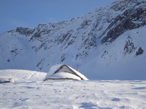 Sehr gute Verhältnisse, meist Pulverschnee zwischendurch mit leichtem Winddeckel. Der Schnee der südexponierten Hänge nahe des Grenzgrats wurde durch die starke Sonneneinstrahlung ab Mittag aufgeweicht, war aber noch gut fahrbar. Wir konnten bei San Giacomo-di Manio auf 2350m ein ca. 35° steiles ostexoniertes Couluar mit gebundenem Pulverschnee ohne Probleme befahren.