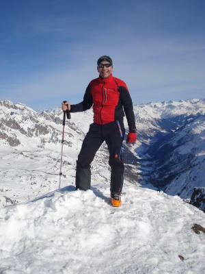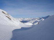 Sehr gute Verhältnisse, meist Pulverschnee zwischendurch mit leichtem Winddeckel. Der Schnee der südexponierten Hänge nahe des Grenzgrats wurde durch die starke Sonneneinstrahlung ab Mittag aufgeweicht, war aber noch gut fahrbar. Wir konnten bei San Giacomo-di Manio auf 2350m ein ca. 35° steiles ostexoniertes Couluar mit gebundenem Pulverschnee ohne Probleme befahren.