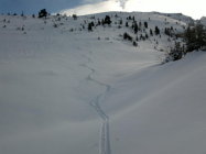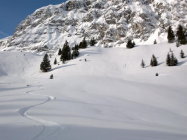 Gute Verhältnisse. Es hat schon auf Höhe Grimmialp ein Schäumchen Neuschnee auf dem verregneten und schwach gefrorenen Altschnee. Weiter oben dann 10 bis 15 cm Pulver auf tragender Unterlage, allerdings teilweise verblasen. Es ist in der Abfahrt nicht ganz einfach, die schönen Hänge zu finden. Trotzdem viel schöne Stellen bis zur Strasse auf rund 1650 MüM, darunter dann im Würzi leider nicht genügend angefroren, sodass man auf der Strasse bleiben muss und nicht die steilen Hänge im Würzi fahren kann. Aber das wird noch besser, es hat so viel Schnee wie nie in den letzten Jahren! Wenn es richtig gefriert und nochmals draufschneit, wird das wunderbar.
