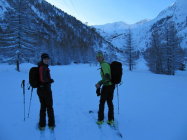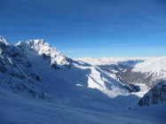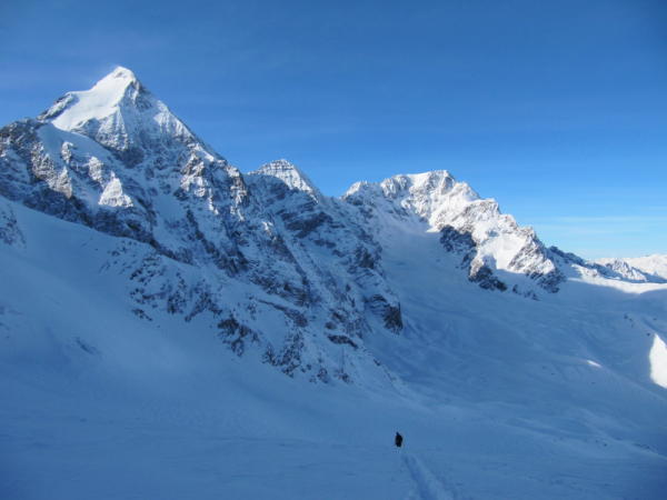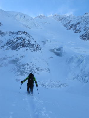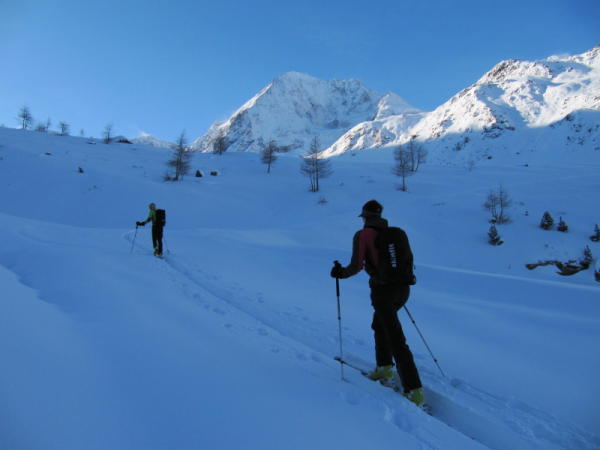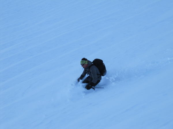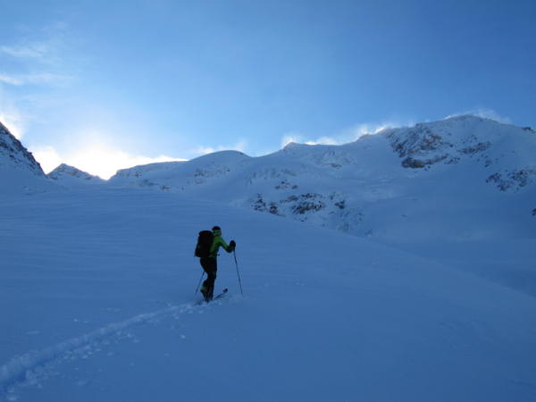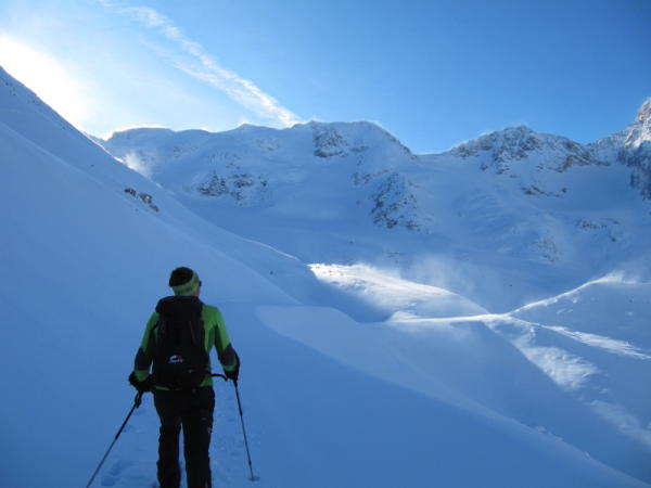 Abfahrt bei schlechten Verhältnissen. Zur Zeit keine guten Schitourenverhältnisse in der Region.