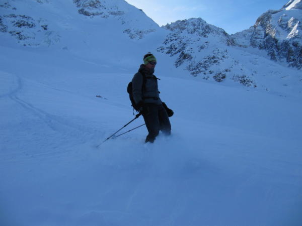 Es hat in Sulden am Tag vorher, bzw. in der Nacht ca. 20cm Neuschnee gemacht. (alt Schnee gleich null). Der Schnee wuchs mit zunehmender Höhe. In der Höhe ging ein starker Wind mit hoher Schneeverfrachtung. Am Sulden Ferner wuchs die Neuschneemenge auf ca. 50cm an.