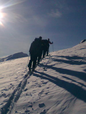 Sehr viel Schnee. Im Gipfelbereich starker Wind und auf der Lee-Seite entsprechende Ablagerungen. Traumhafte Pulverschneeabfahrt.