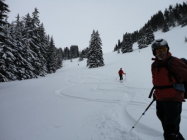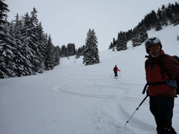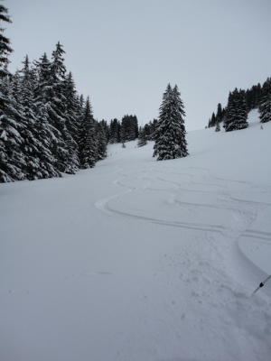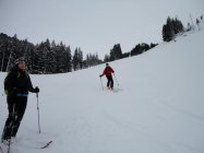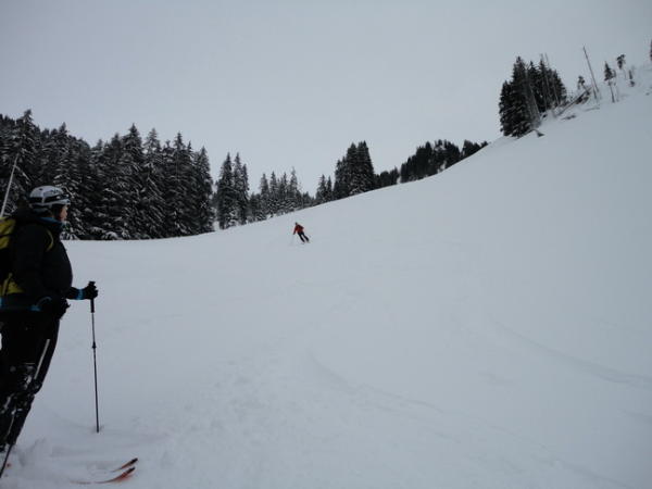 Beste Schneeverhältnissen am Chumigalm wobei Gipfel etwas verblasen ist