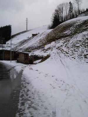 Abfahrt ab Schwendi auf Nassschnee, der kaum mehr einen Bogen erlaubt. Unterster Hang mehr grün, denn weiss.