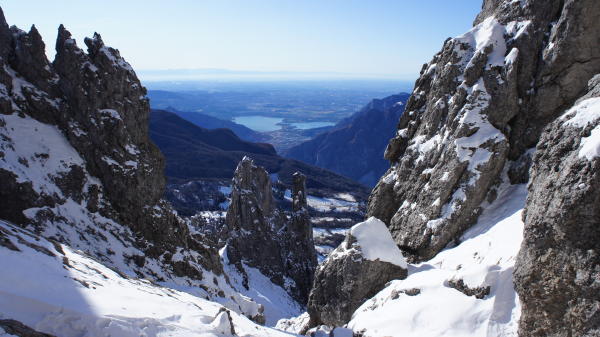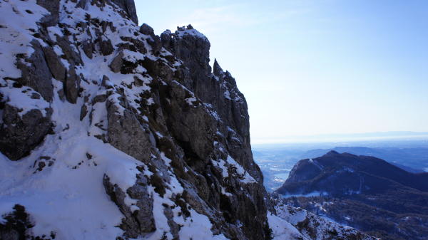 relativ wenig Schnee am Südhang, in den Rinnen mehr, nordseitig ohnehin. Am Klettersteig gute Verhältnisse, viel Trittschnee, wenig Eis, alle Kabel und Ketten gut zu greifen