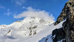 Ab dem grossen Steinmann bis zum Skidepot mit Harscheisen. Dann Wechsel auf Steigeisen und Pickel. Der Gipfel war zwar häufig in Wolken gehüllt, trotzdem konnten wir ab und zu auch einen Weitblick erspähen. Abfahrt zunächst hart ab der "Vedretta della Spianata" schön sulzig. Teilweise so fest, dass man einsank. Uhrzeit passte perfekt und hätte nicht später sein dürfen.