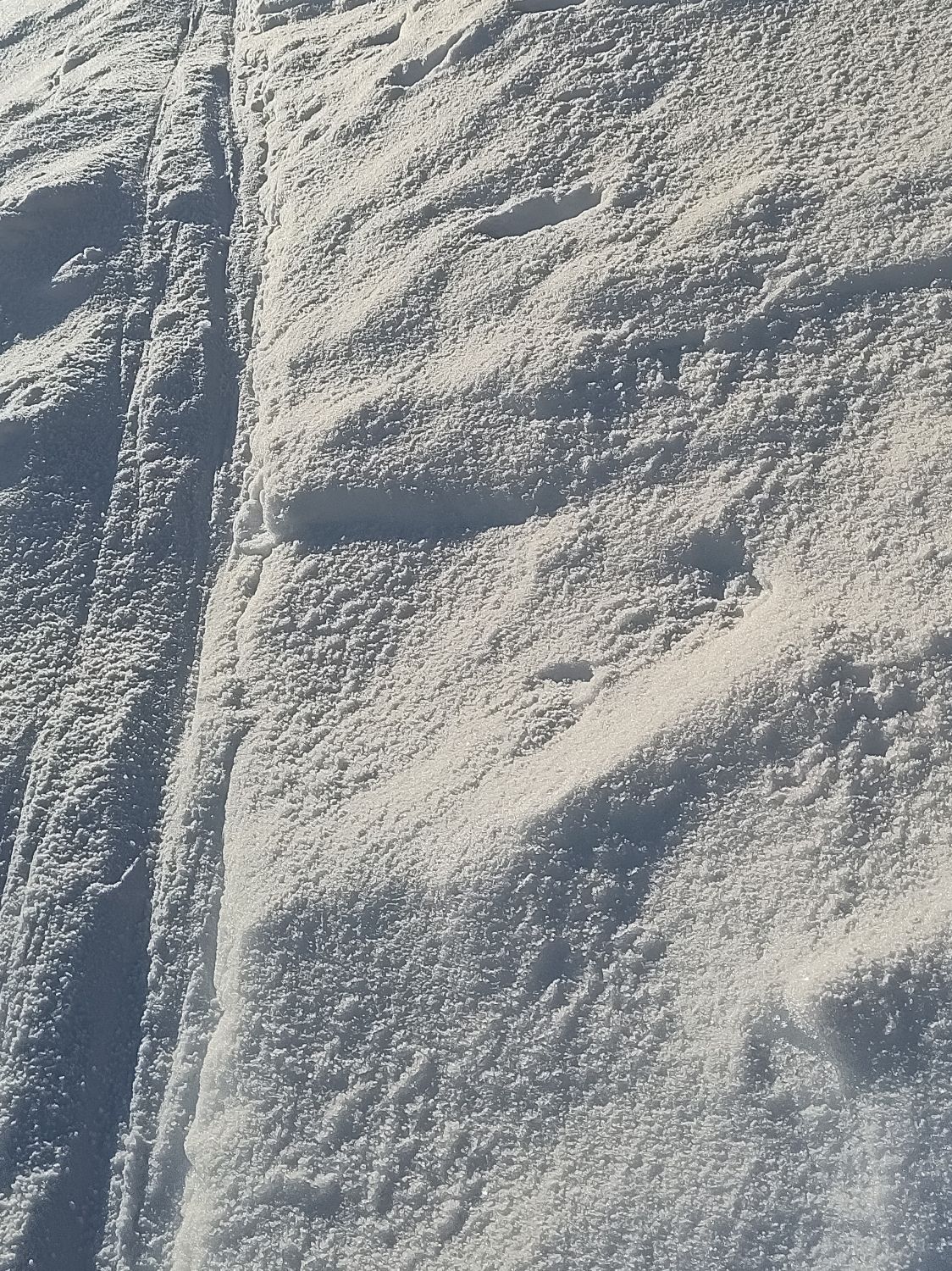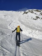 Start bei 2.5°C nach einer sternenklaren Nacht, sehr gute Bedingungen (ich hätte SLF 2= geschätzt). Der Boden war tragen und hart gefroren. Am Abend zuvor muss es wohl leichten Niederschlag gegeben haben, denn es lag viel Graupel. Blick auf zahlreiche und eindrückliche Nasschneelawinen der letzten Tage.