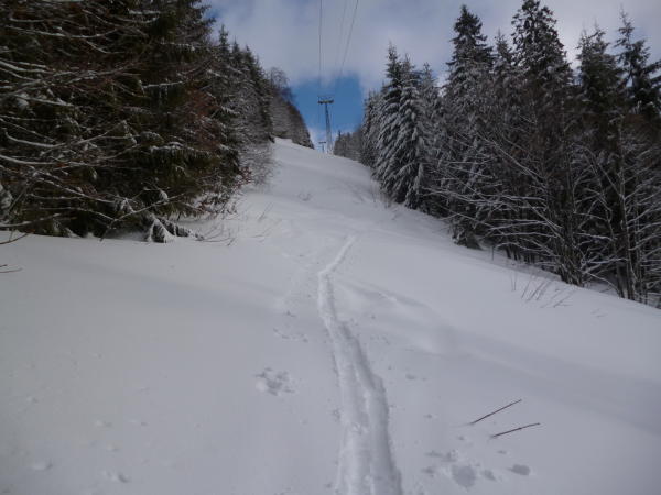 nur eine Spur von der Pistenwalze im Schnee auf der Piste,da heute und bis Do kein Skibetrieb am Taubenstein, Piste selber nur leicht verspurt