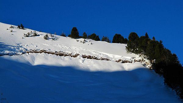 Gipfelhang völlig abgeblasen und vereist. Sehr gute Verhältnisse in der Natur-Halfpipe zum Gustiberg hinunter. Unter raus gut. Bei der Tschingelhütte hat es viele Spuren nach NNO. Wenn man diesen folgt, überquert man den Graben zum Skilift ohne Brücke...
