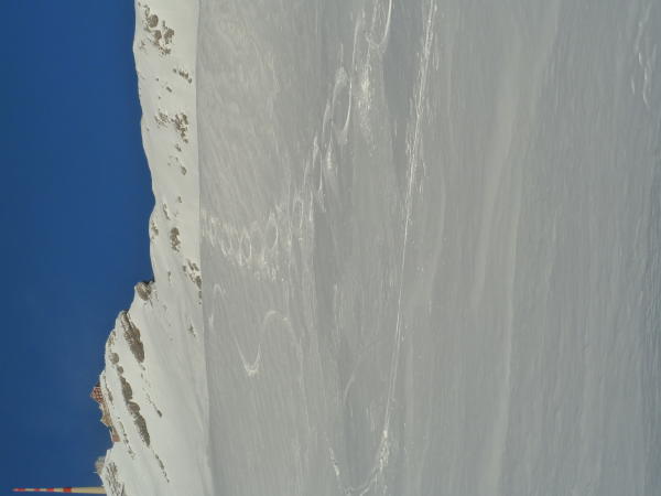 Oben ist der Schnee relativ stark windgeprägt, aber ohne probleme zum fahren. Teilweise ein Anfang zu einem Harschdeckel...