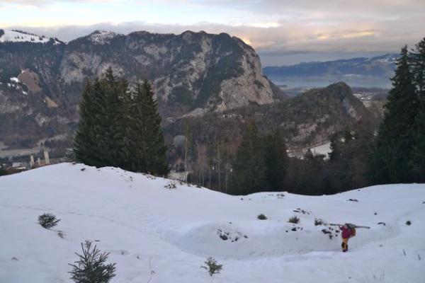 Ausreichend Schnee ab ca. 1000 m, alles darüber für Aufstieg und Abfahrt wunderbar (hart und Pulver, nur sehr wenig Bruchharsch in der Zone dazwischen). Bartgeier vor Fromberghorn. Ausser uns niemand im Gebiet gesehen.