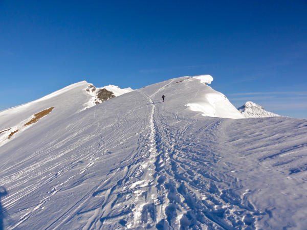 Am gesamten Sattligrat sind grosse Wächten vorhanden, was eine sorgfältige Routenwahl verlangt! Ein Wächtenstück stürzte vor unseren Augen als veritable Lawine ins Tal.