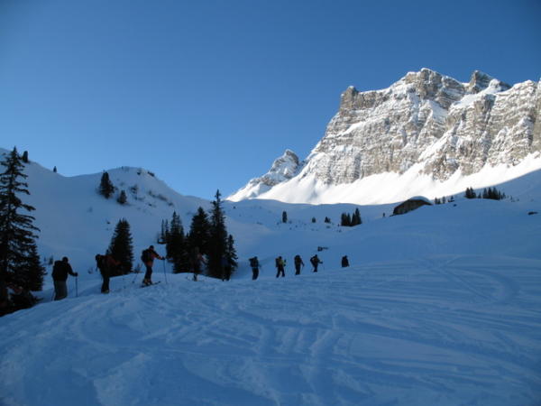 Sehr gute Verhältnisse auf der ganzen Route. erstaunlich gut auch die sonnenexponierte Gipfelflanke. Nordseite wurde in der ganzen Breite an verschiedenen Stellen gefahren. Dort leicht gepresster Pulver.
