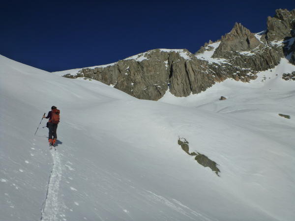 Aufstieg (S-Hang): günstige Verhältnisse; gute Spur, Gipfelaufschwung gegenwärtig problemlos ohne Steigeisen