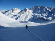 Abfahrt vom Gipfel vorbei an der alten Zollwachhütte in das Flathbachtal, dann wieder Aufstieg in das Tal zwischen Schwarzer Kopf und Vorderes Kreujoch auf den Gipfel des V.Kreuzjoch 2845m.