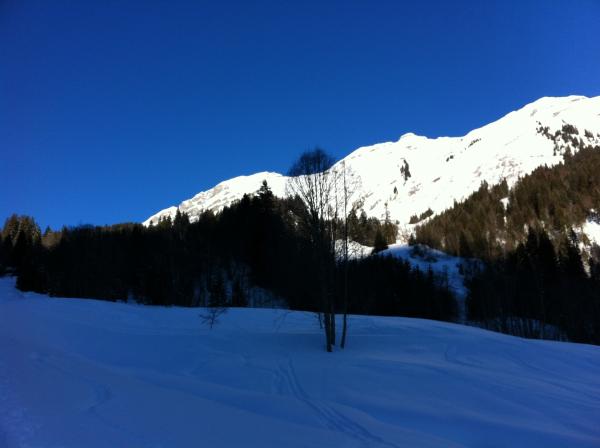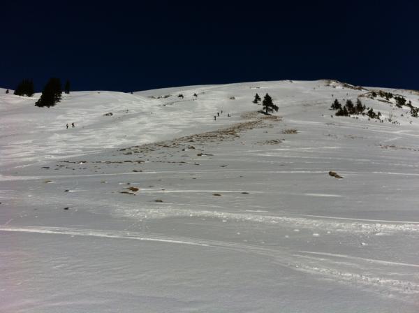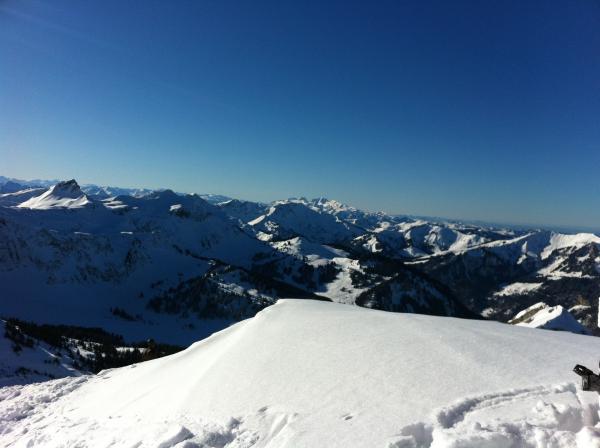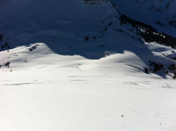 Bis Gipfelhang mehr oder minder noch schöner Pulverschnee, dem man v.a. im Wald gut fahren kann.
