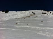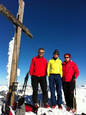 Gipfelhang selbst gut verfestigt. Kleine Pulverschneeauflage. Gute Verhältnisse zum Aufsteigen. Harscheisen im Gepäck empfehlenswert.