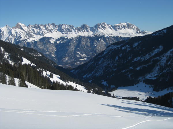Abfahrt über Schaffans Hüttli (2109 müM) über Maralda und Werdenböl, die Waldparie "Hinter dem Märenbach" muss möglichst hoch gequert werden. Unsere Spuren führen zu tief ins Bachbett hinunter ! Dann über die flachen Hänge zurück zur Alp Wisen.
