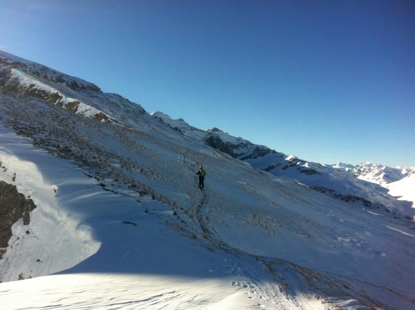 Im Aufstieg von Fisetenbahn her sehr verblasen, auf dem Langfirn Windharsch.