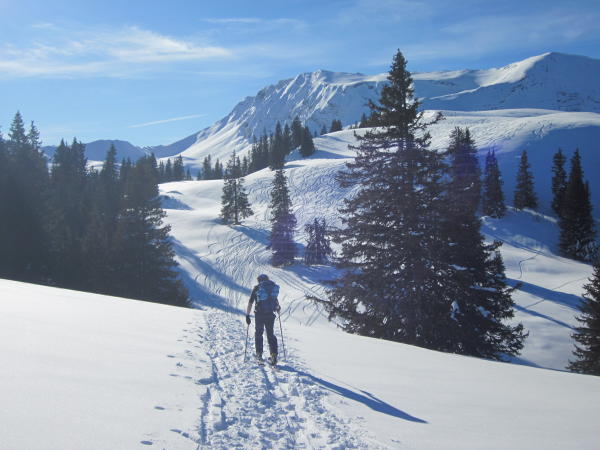 Stark begangene Route, die Abfahrtshänge sind schon total zerfahren. Lohnt sich aber dennoch.