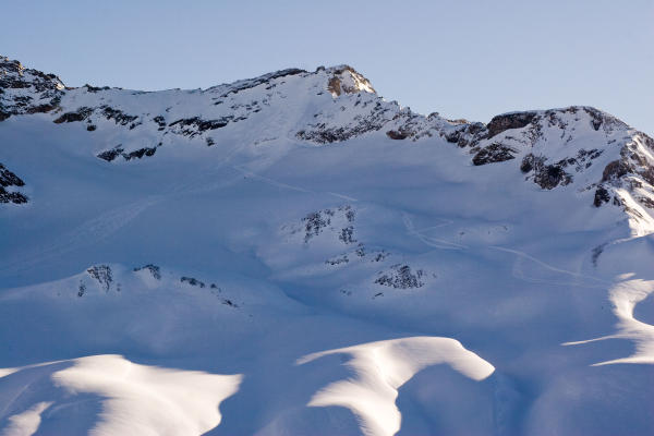 Querung von der Fanez- zur Ducanfurgga sowie den Gipfelhang auf jeden Fall mit Entlastungsabständen begehen und einzeln abfahren.