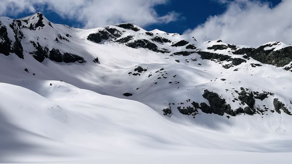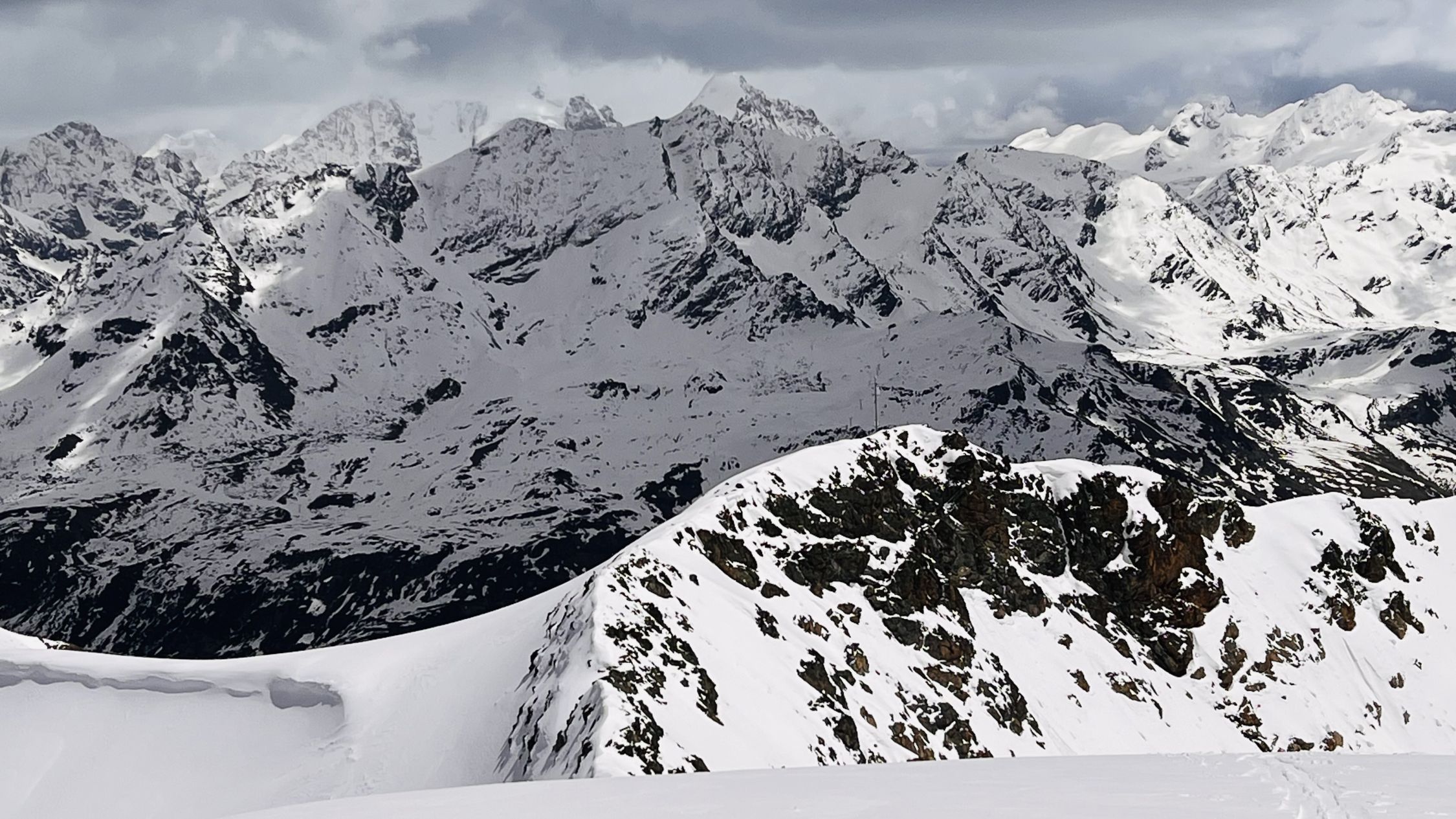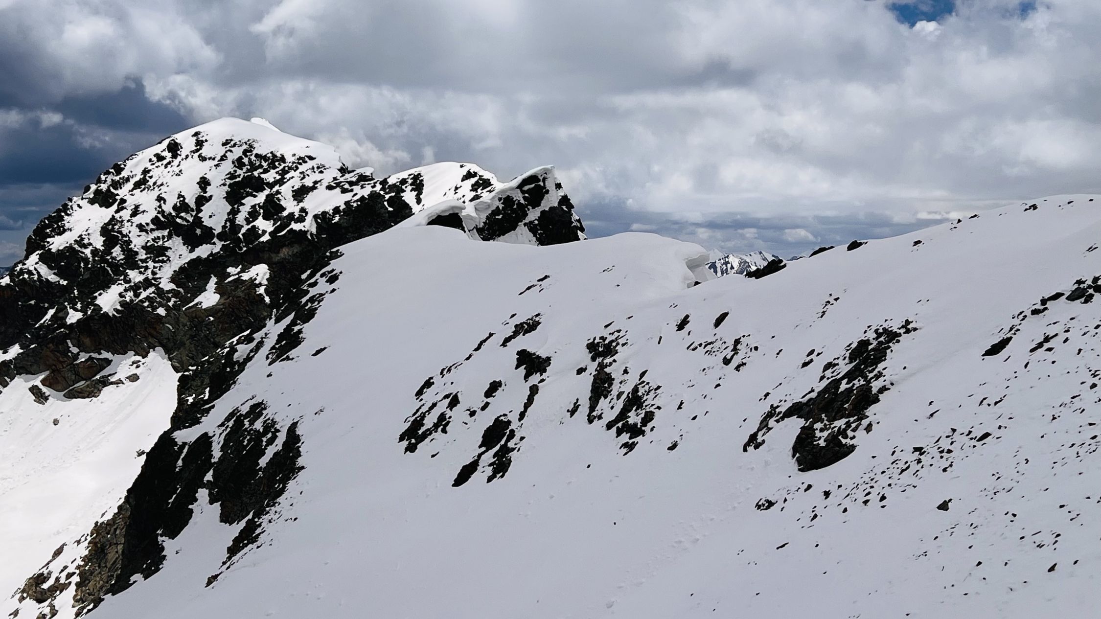 Bin erst um 12 Uhr bei der Alp Güglia (2190m) los und war zwei Stunden später am Vorgipfel 3110m. Top-Verhältnisse, musste nur den Talboden zu Fuss durchqueren und dann auf tragendem Schnee bis zum Vorgipfel. Der Grat zum Gipfel ist stark überwächtet, war mir zu spannend und bringt skimässig nix. Oben knapp 10 cm Pulver und unten Sulz, selbst der letzte, steindurchsetzte Hang zum Talboden trug noch gut um 14:45 Uhr.