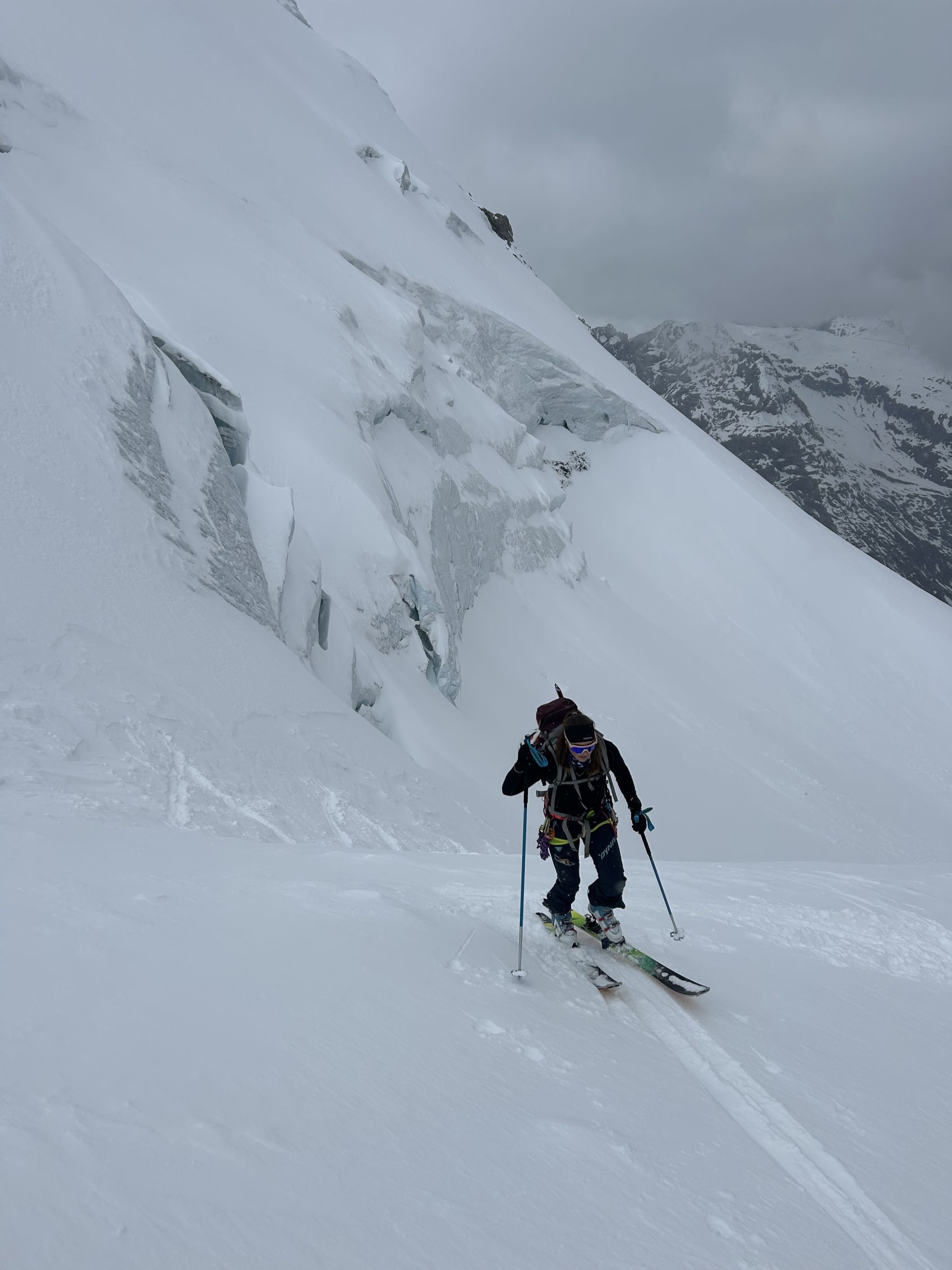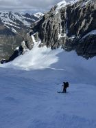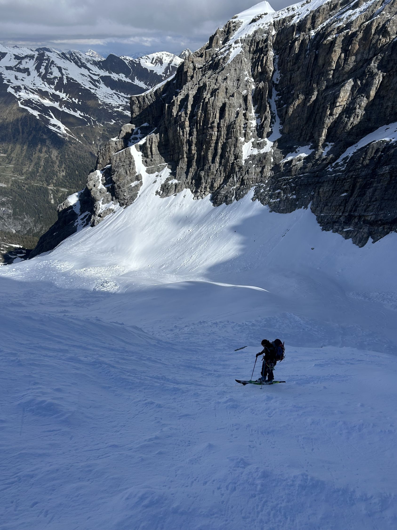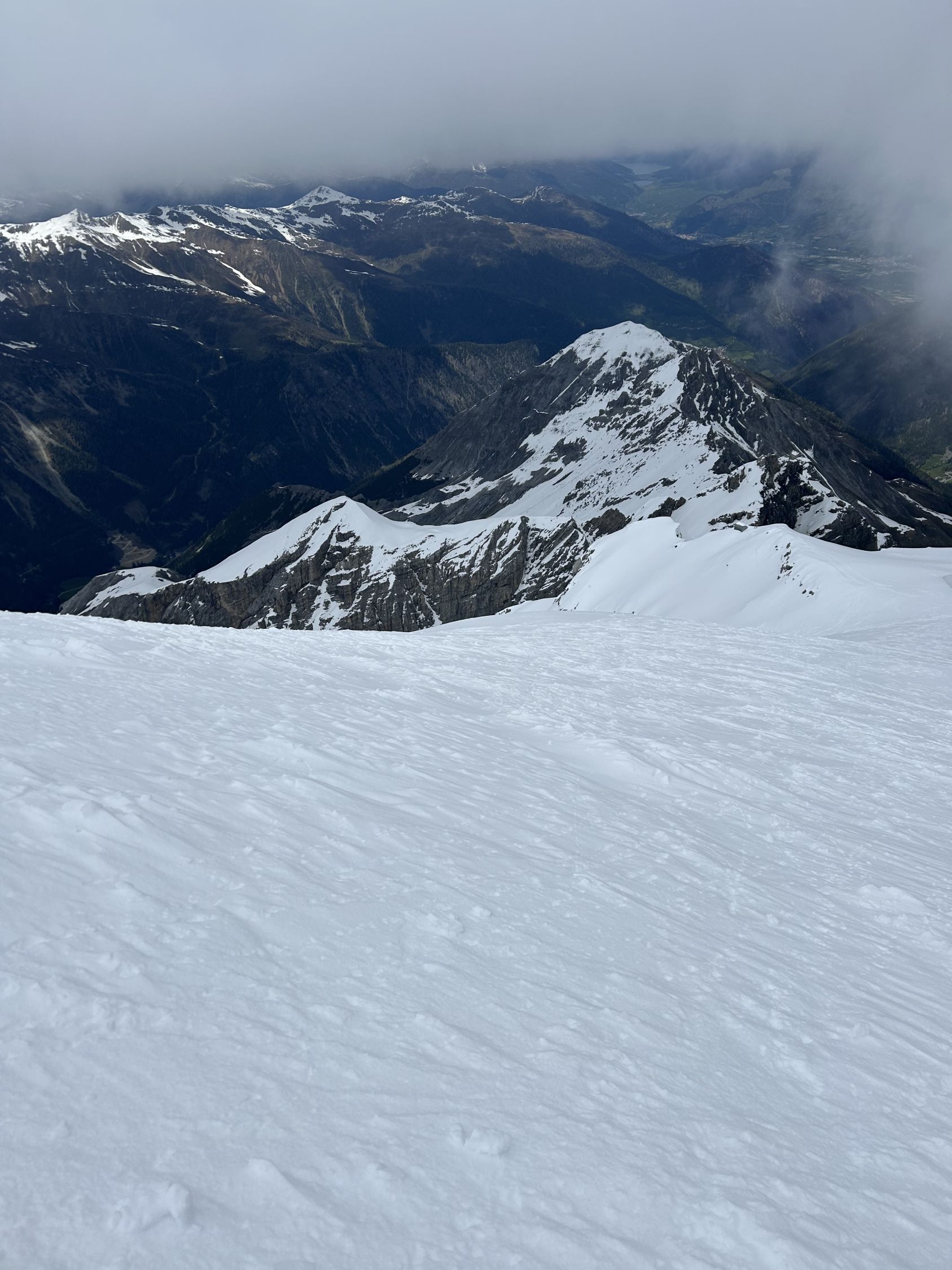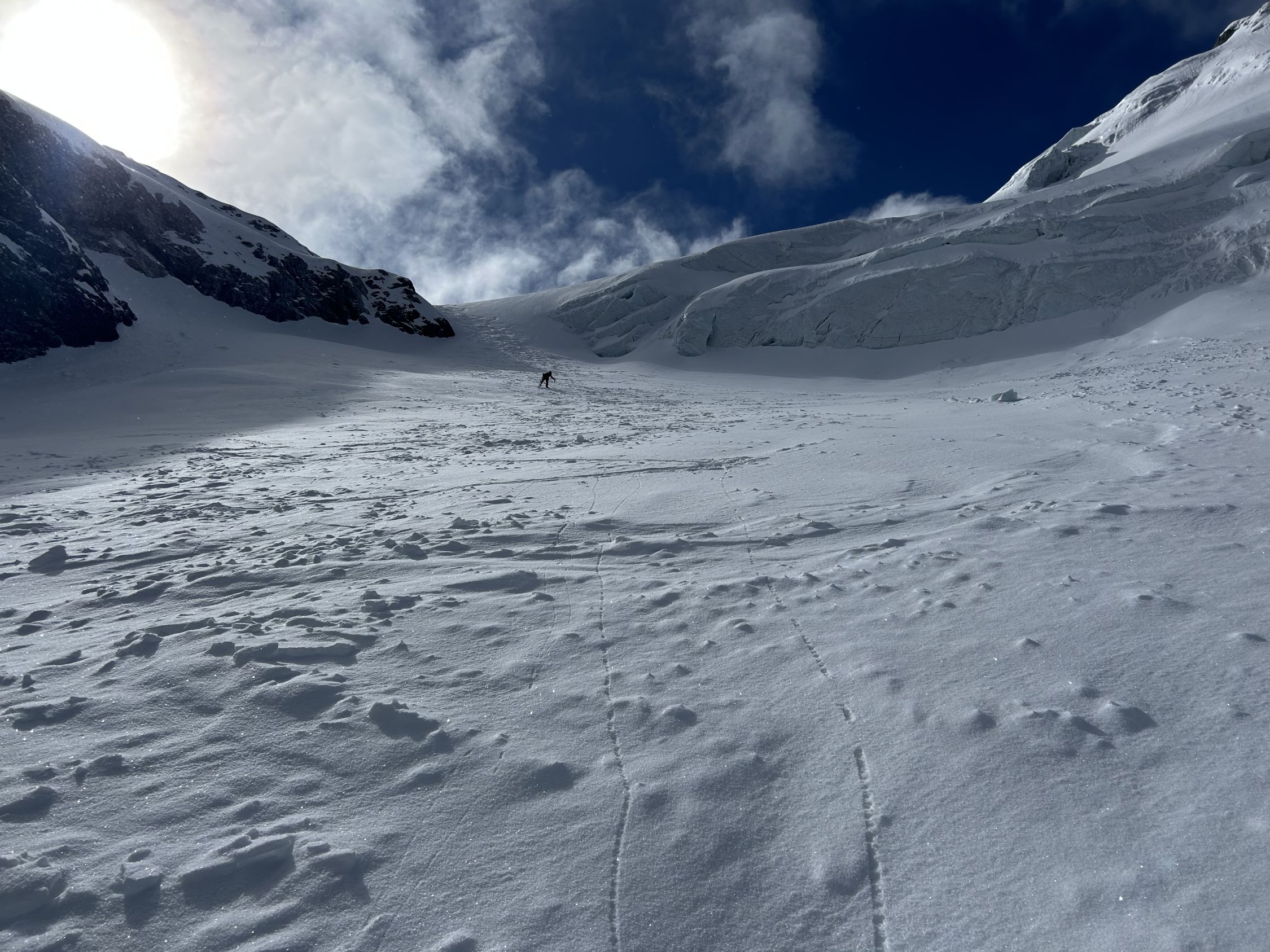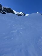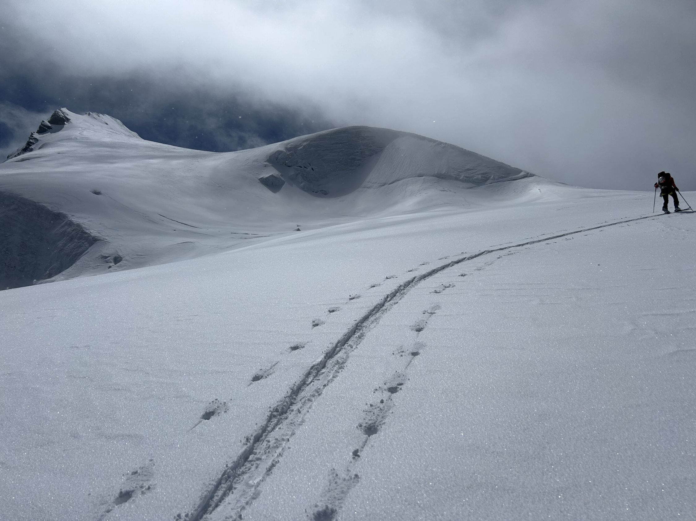 Start: 6:40h Ausnehmend gute Verhältnisse. Die Skier müssen ab der Hütte ca. 45 Minuten getragen werden. Nun anhaltend steil bis auf Höhe des Lombadibiwaks im schönsten Pulverschnee und von dort den nochmals steilen Hang bis auf ca. 3650m. Für diesen Hang braucht es zwingend Steigeisen, unter dem Pulverschnee ganz kurz blankes Eis. MIT Steigeisen sehr gut machbar. Nun zum Gipfel. Ankunft 13:20h.