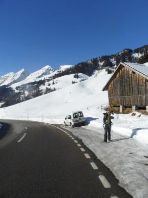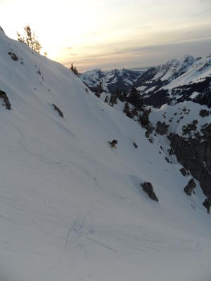 Da Rinne links fahrerisch nicht mehr so lecker das mittlere gewählt.oben kurz hart,ab Mitte durch Rinne pudrig und zu unserem Erstaunen bis Strasse runter super Puder,zum Teil etwas gesetzt oder da spät etwas angekrustet-super!mit Ski bis PW.
