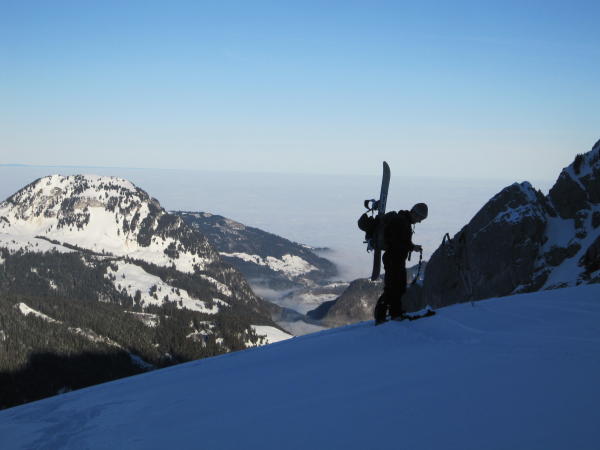 Snowboardtour, gute Spurlage, Abfahrt durch NW-Flanke, Drop-in ohne Probleme.