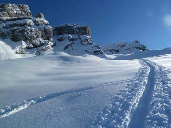 Aufstieg südseitig auf dem Normalweg, Abfahrt über die NW -Flanke. Ca. 20-30 cm Pulver mit Schmelzharschdeckel, der südseitig ausgeprägter ist. Heute einige Leute am Muteri und am Redereten unterwegs.