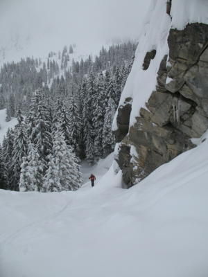 Ständiger, leichter Schneefall begleitete uns bis knapp unter den Gipfel, wo wir dann wegen Null Sicht umkehrten. Wadentiefe Spurarbeit in herrlichem Pulver. Unter ca. 1500m wegen höherer Temperatur etwas schwererer Pulver. Es war nicht ganz soo kalt wie angesagt: -3° auf 2000m.