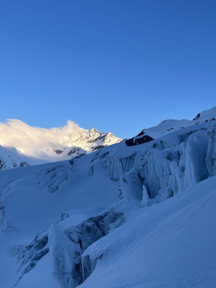 Danach mal mit, mal ohne Harscheisen hoch bis auf ca 3500. Hier schluckt man einige male leer und sollte ein paar Gänge höher schalten, um möglichst wenig Zeit unter den Séracs zu verbringen, die durchaus die Route treffen könnten. Ist aber sicher nicht so heikel wie z.B am Grand Combin derzeit, wo fast täglich Einfamilienhäuser in den Korridor stürzen. Es liegen kaum frische Eistrümmer herum. Bis zum Skidepot ohne grosse Schwierigkeiten, teilweise grosse Spalten, die aber gut sichtbar sind. Heute war im Gipfelbereich ein bissiger, kalter Nordwestwind, der es ziemlich ungemütlich machte. Spur zum Gipfel ist in einem guten Zustand, gute Tritte und kein Blankeis, heute sicher ca. 40 Leute am Gipfel, das Kreuzen am teils recht schmalen Grat, vor allem am Schluss, muss etwas geplant werden aber wenn alle mitdenken klappt auch das gut. Abfahrt dann via Aufstiegsroute und dann so früh wie möglich auf das Ewigschneefeld, um zurück zum Jungfraujoch zu kommen. Wollten zuerst über die Lötschenlücke nach Blatten aber dort scheint wohl das ganze Dorf wegen eines massiven Murgangs evakuiert zu werden. Motivation hielt sich ebenfalls in Grenzen, da aktuell ca 1h Ski getragen werden müssen bis zur Fafleralp (Infos aus Hütte).