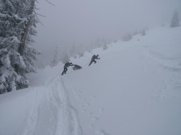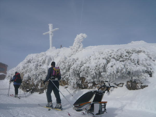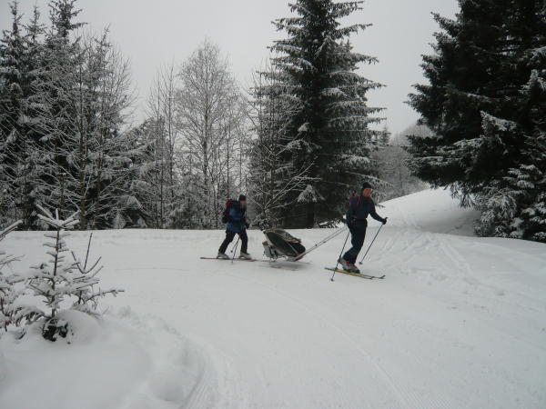 Gut geeignet zum Kinderschlitten ziehen, weil großteils gewalzte Rodelbahn. Tipp: Nicht wie wir bei der großen Kehre der Schitourenspur folgen, sondern auf der Rodelbahn bleiben!