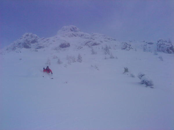 Zuerst im Nebel bis Pass zwischen Schafarnisch und Widdergalm, dann Versuch über Sommerwegcouloir in Richtung Punkt 2000m auf Märe-Südwestrücken - abgebrochen auf 1900m da zu steil (Hammerpowder im Couloir ;-)), dann Westflanke bis 100m unter Gipfel, aber wegen Schneebrettern abgebrochen... Die Flanke ist 1A!
